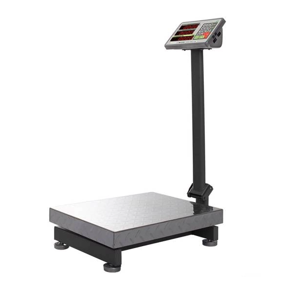 Высота платформы регулируется с помощью опор. Установлено 2 LCD-дисплея: для продавца и покупателя. Табло располагается на складной стойке. Доступно 5 ячеек памяти для сохранения цен товаров.